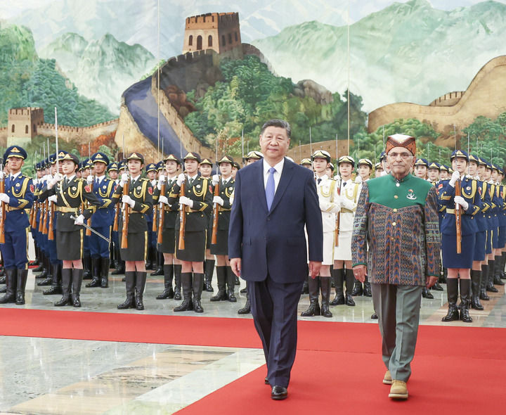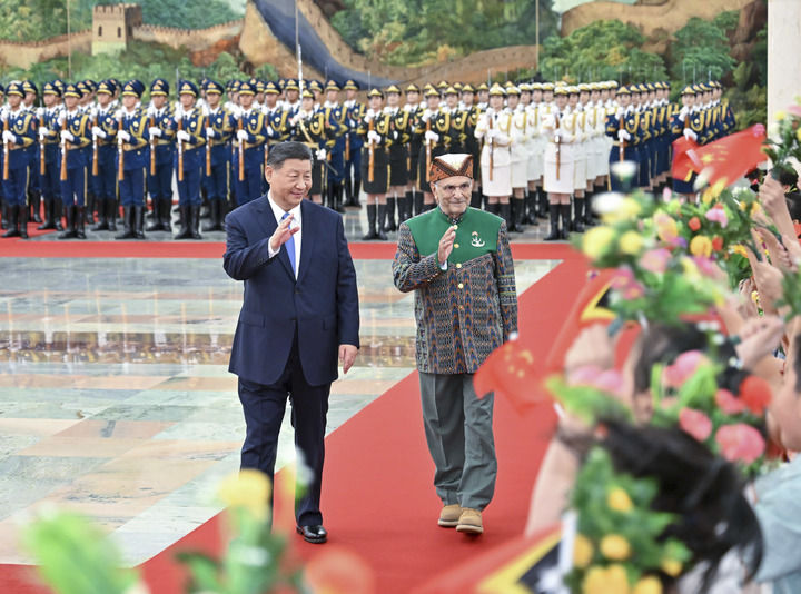 7月29日上午,国家主席习近平在北京人民大会堂同来华进行国事访问的东帝汶总统奥尔塔举行会谈。这是会谈前,习近平在人民大会堂北大厅为奥尔塔举行欢迎仪式。新华社记者 岳月伟 摄