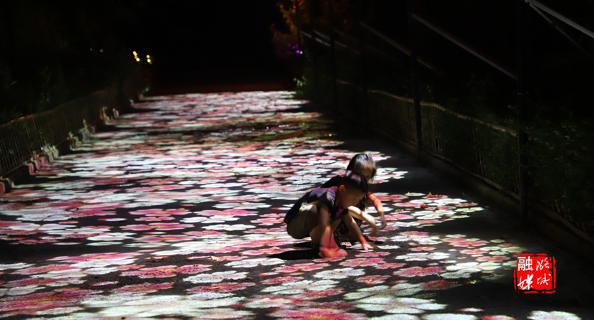 夜幕降临,在辛安泉镇南流村的观光农业生态园,一场光与影的碰撞在悄然“出圈”,在花草树木和小桥流水间,感受如梦幻般绚烂场景,“召唤神龙“、”诗词歌赋”、“秘境萤火“……让游客在光影变化中感受自然魅力、田园活力和灯光绚丽。