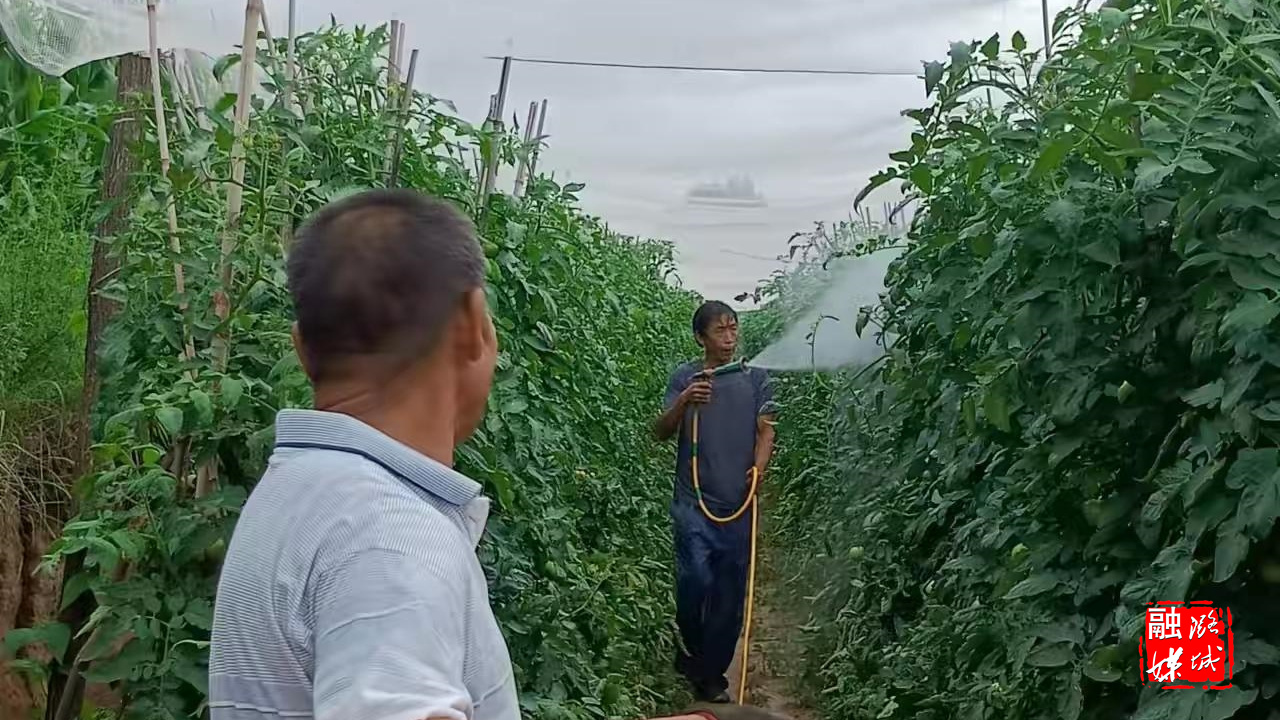 ▲成家川街道神泉村对旱地西红柿进行售后打药管理。
