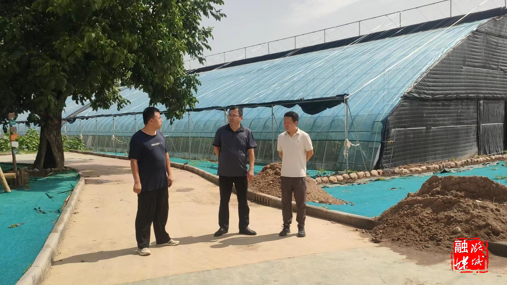 ▲辛安泉镇相关负责人在西流北村查看兴泉生态农场建设进展情况。