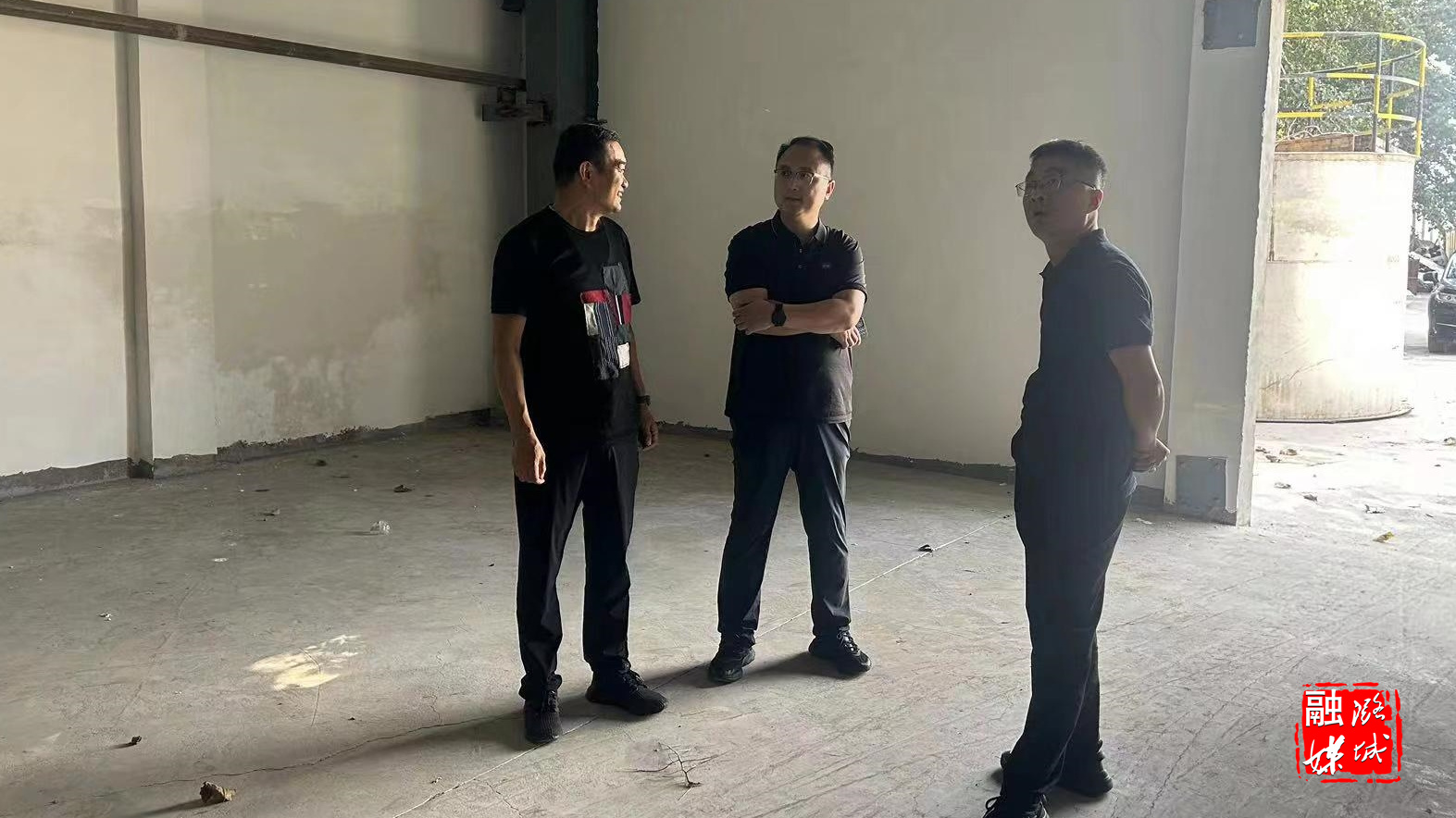 ▲成家川街道负责人在龙富达生态农业有限公司查看土壤调理剂项目建设进度。