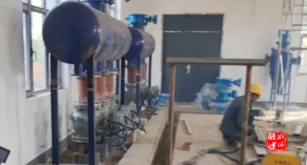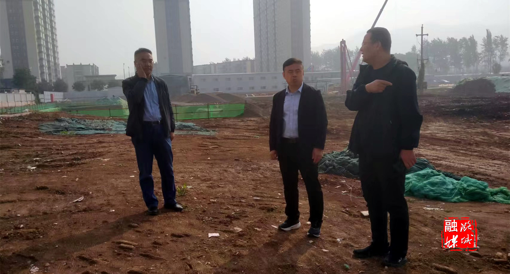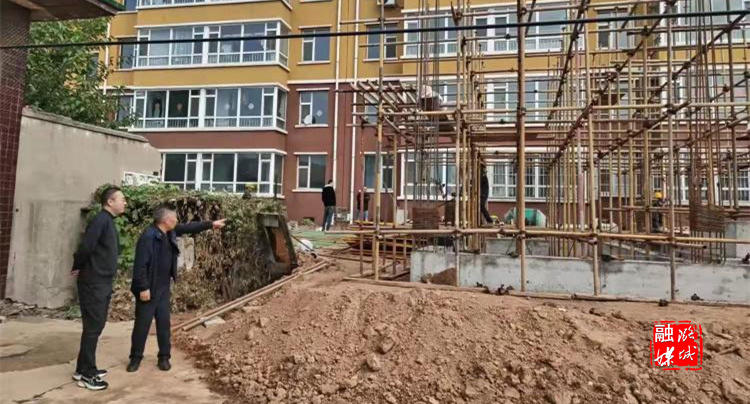 ▲微子镇相关负责人在红旗小区查看集中供暖换热站建设施工进度。