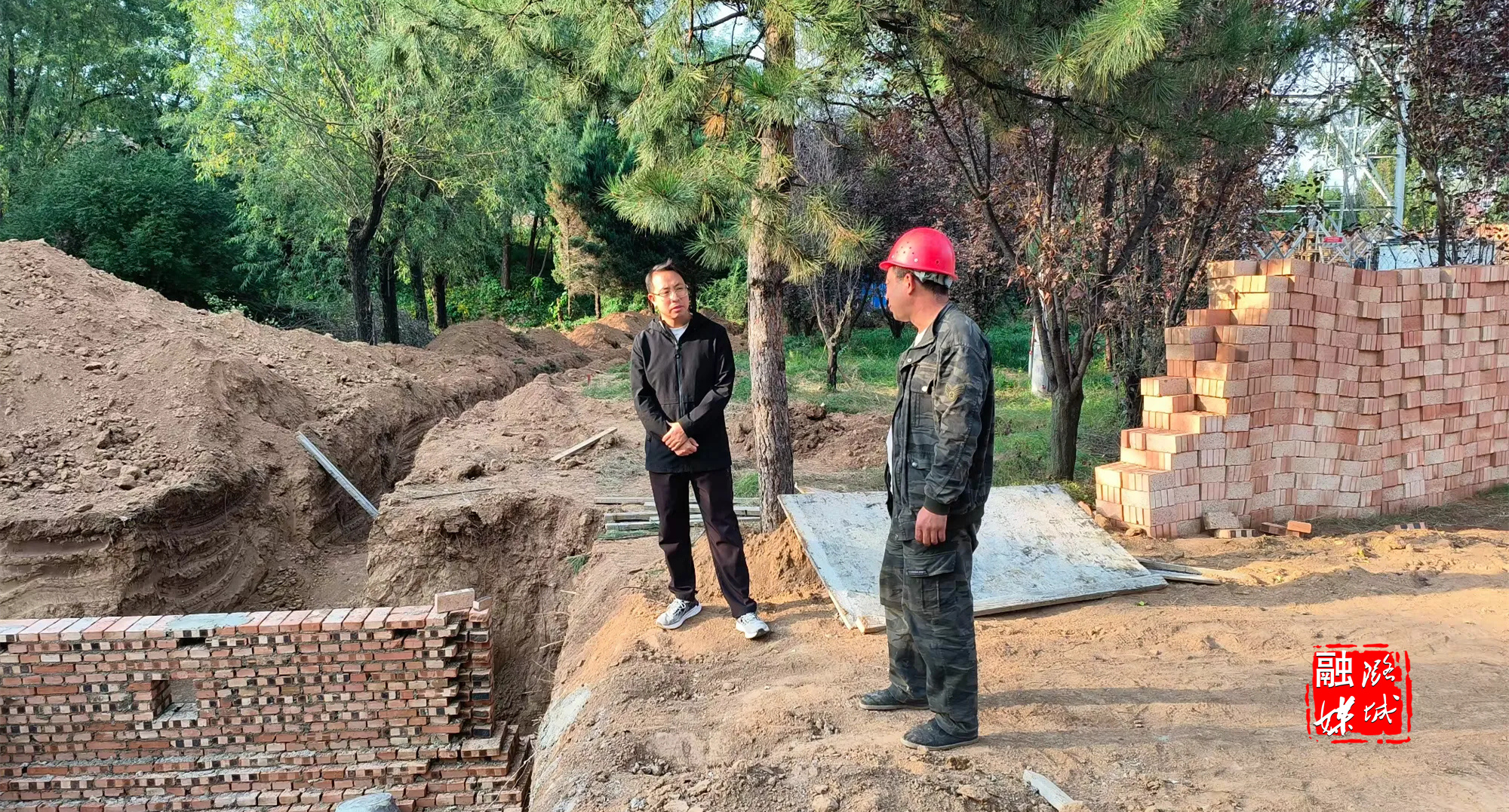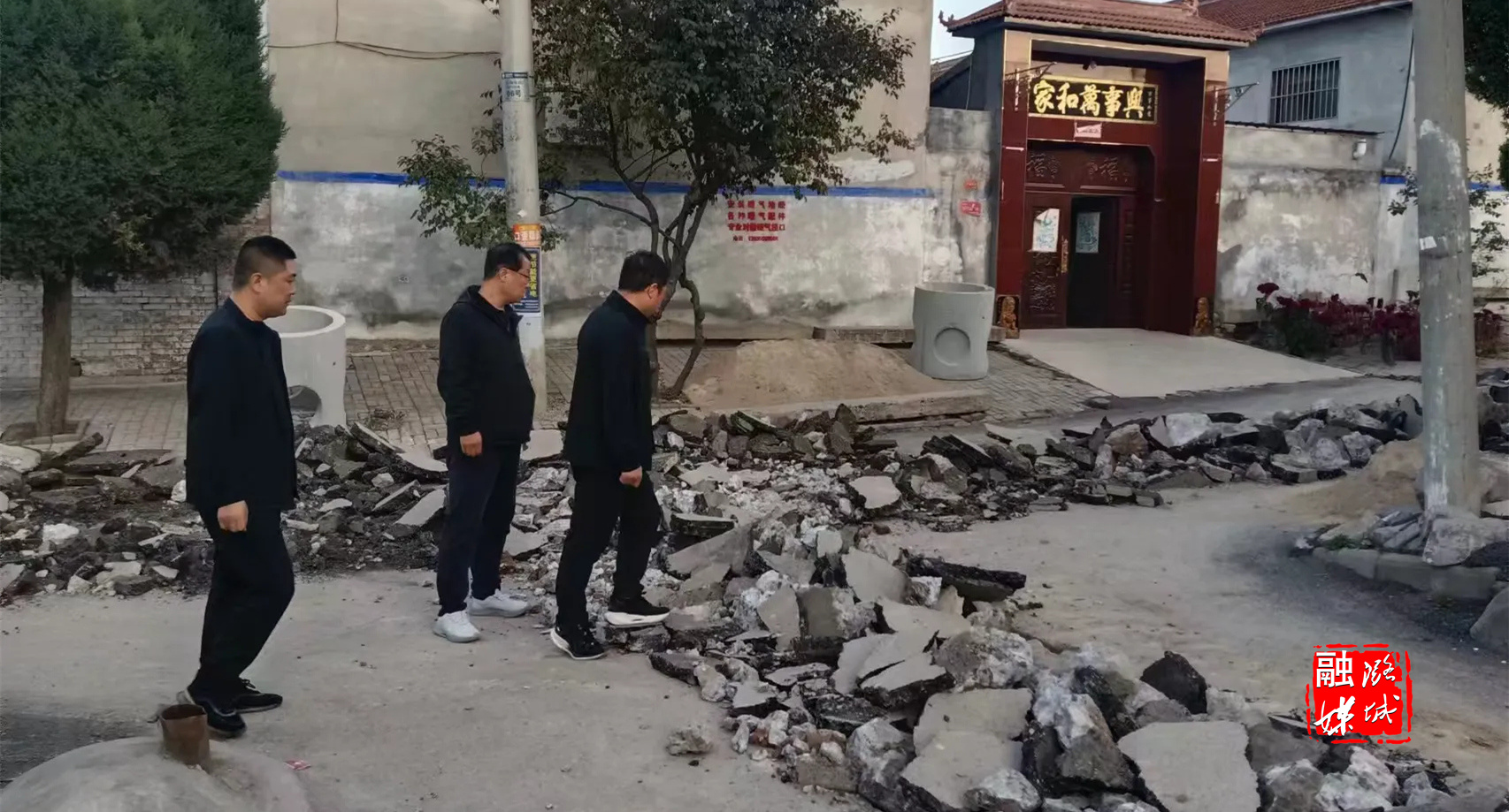 ▲史回镇工作人员到小沟村查看集中供热工程进展情况。