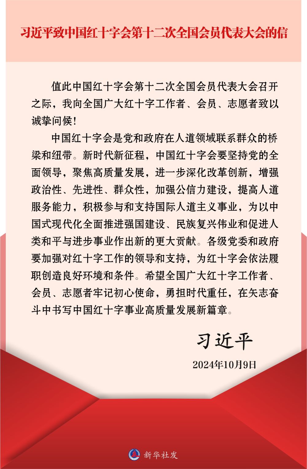 新华社北京10月9日电 在中国红十字会第十二次全国会员代表大会召开之际,中共中央总书记、国家主席、中央军委主席习近平致信大会,向全国广大红十字工作者、会员、志愿者致以诚挚问候,并对做好红十字工作提出希望。