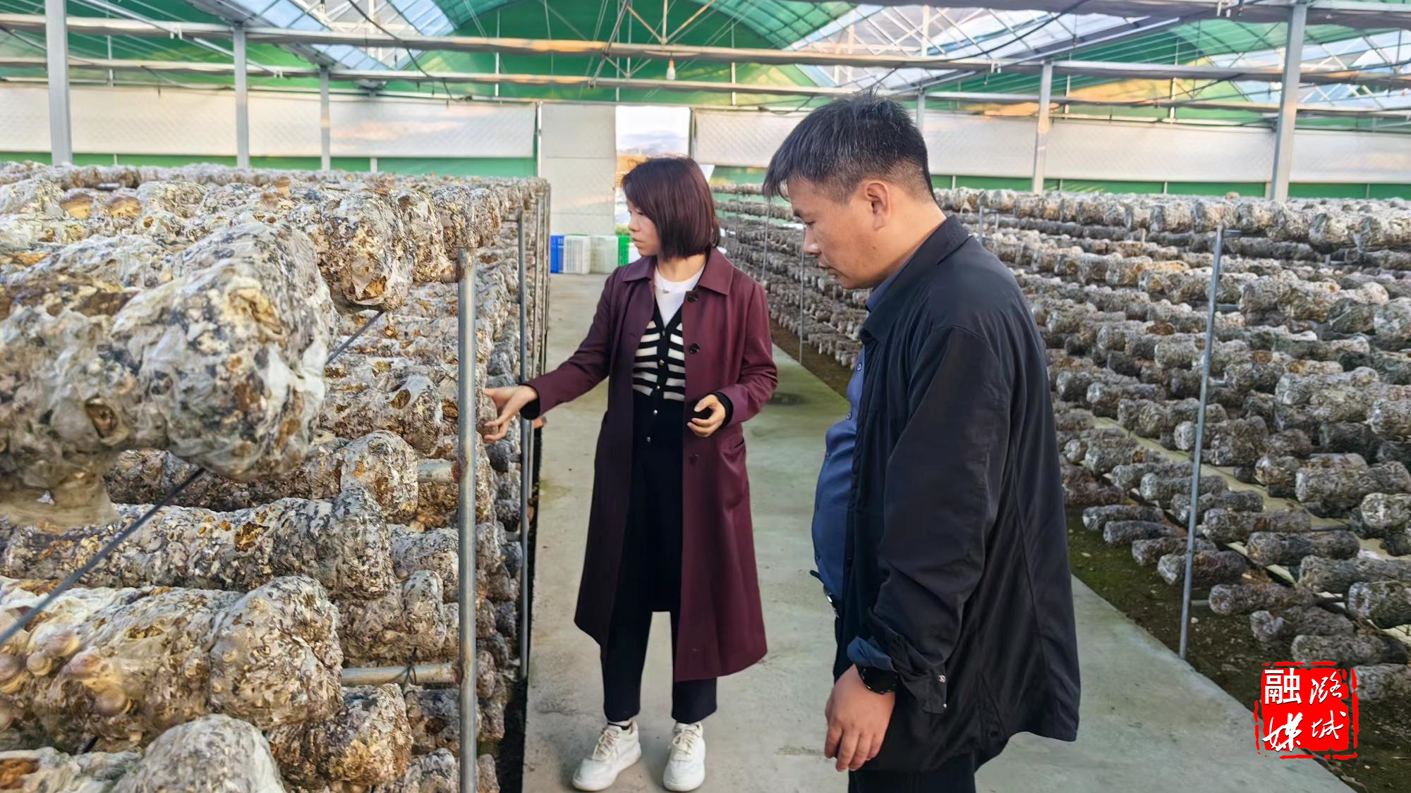 ▲史回镇相关负责人到食用菌现代农业产业园查看香菇出菇和菌棒培养情况。