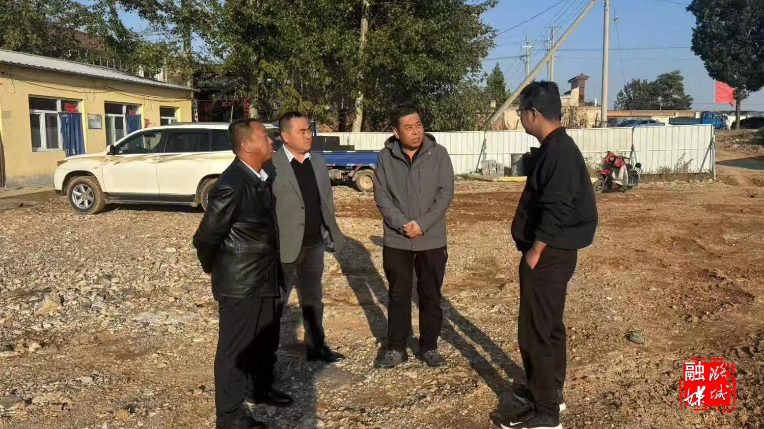 ▲微子镇相关负责人与区住建局工作人员在神头村查看神头之战纪念园配套基础设施项目建设情况。