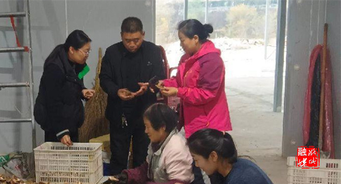 ▲微子镇相关负责人在东靳村查看香菇大棚建设及香菇销售情况。