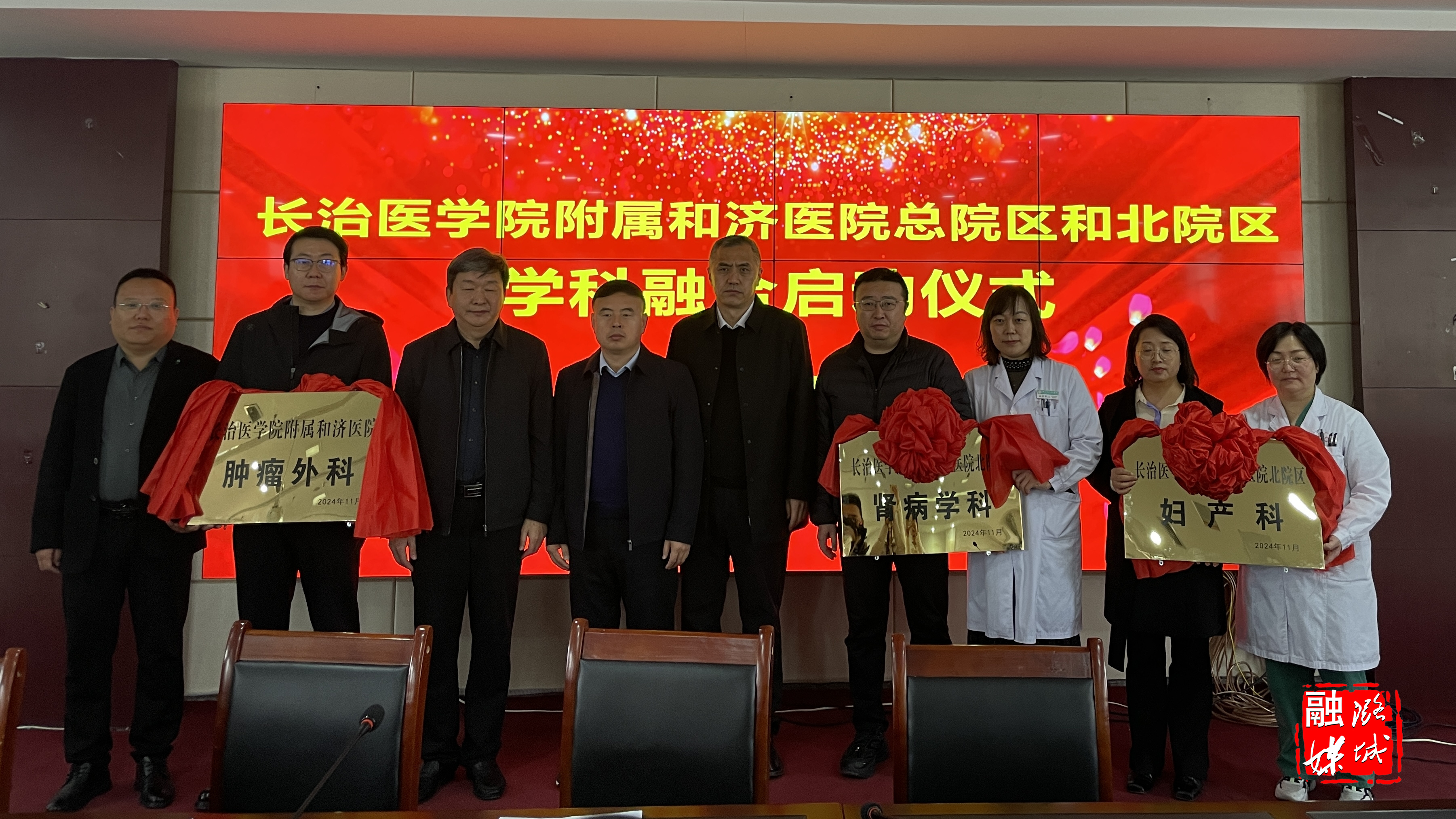 ★11月18日,长治医学院附属和济医院总院区和北院区学科融合启动仪式举行。长治医学院附属和济医院院长郝少峰,副区长王振华出席仪式,并为长治医学院附属和济医院总院区肿瘤外科和北院区妇产科、肾病学科科室授牌。