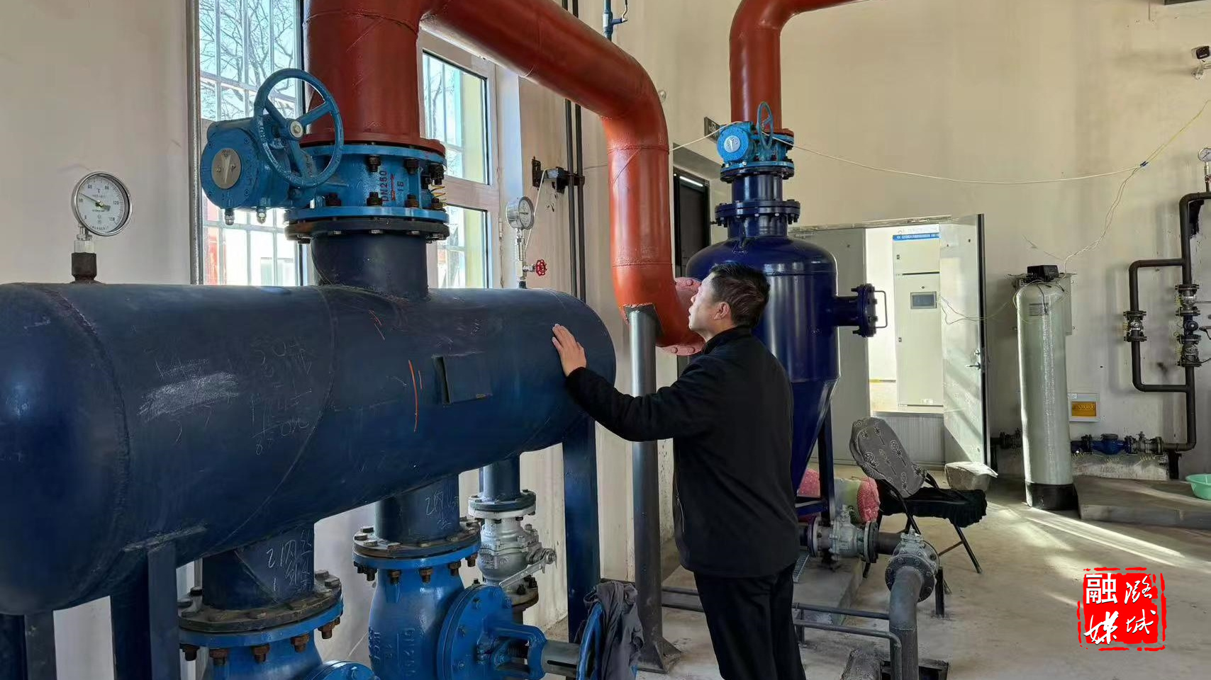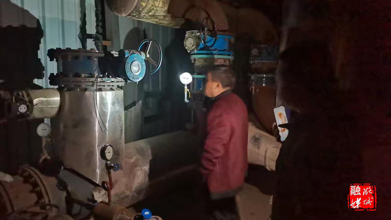 ★11月26日,史回镇小沟村两委主干在村查看供水、雨污分流、集中供热工程换热站建设运行情况。