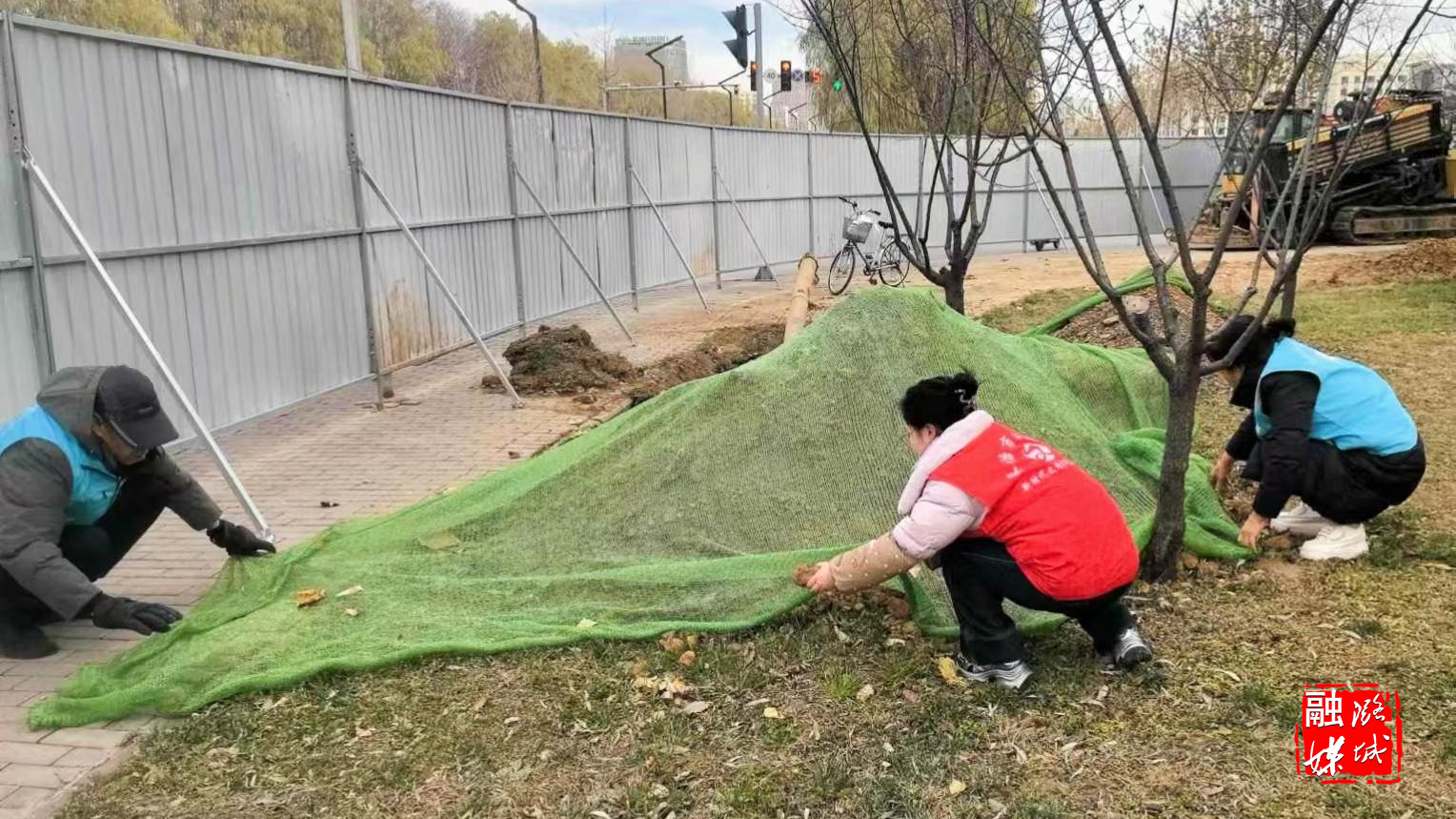 ★潞华街道新华社区工作人员对露天裸土进行物料苫盖。