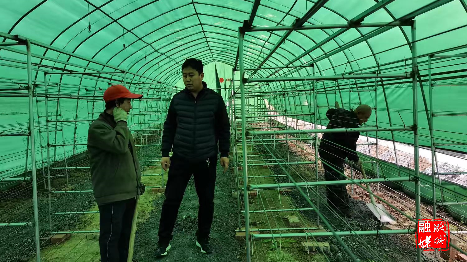 ▲黄牛蹄乡工作人员到香菇基地查看自主改造的注水设备调试以及反季节蔬菜种植情况。