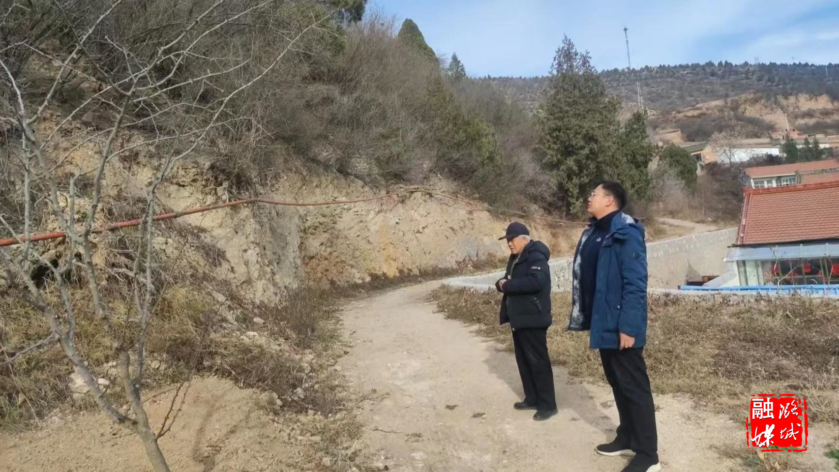 ▲店上镇负责人与施工方负责人实地查看项目建设情况。