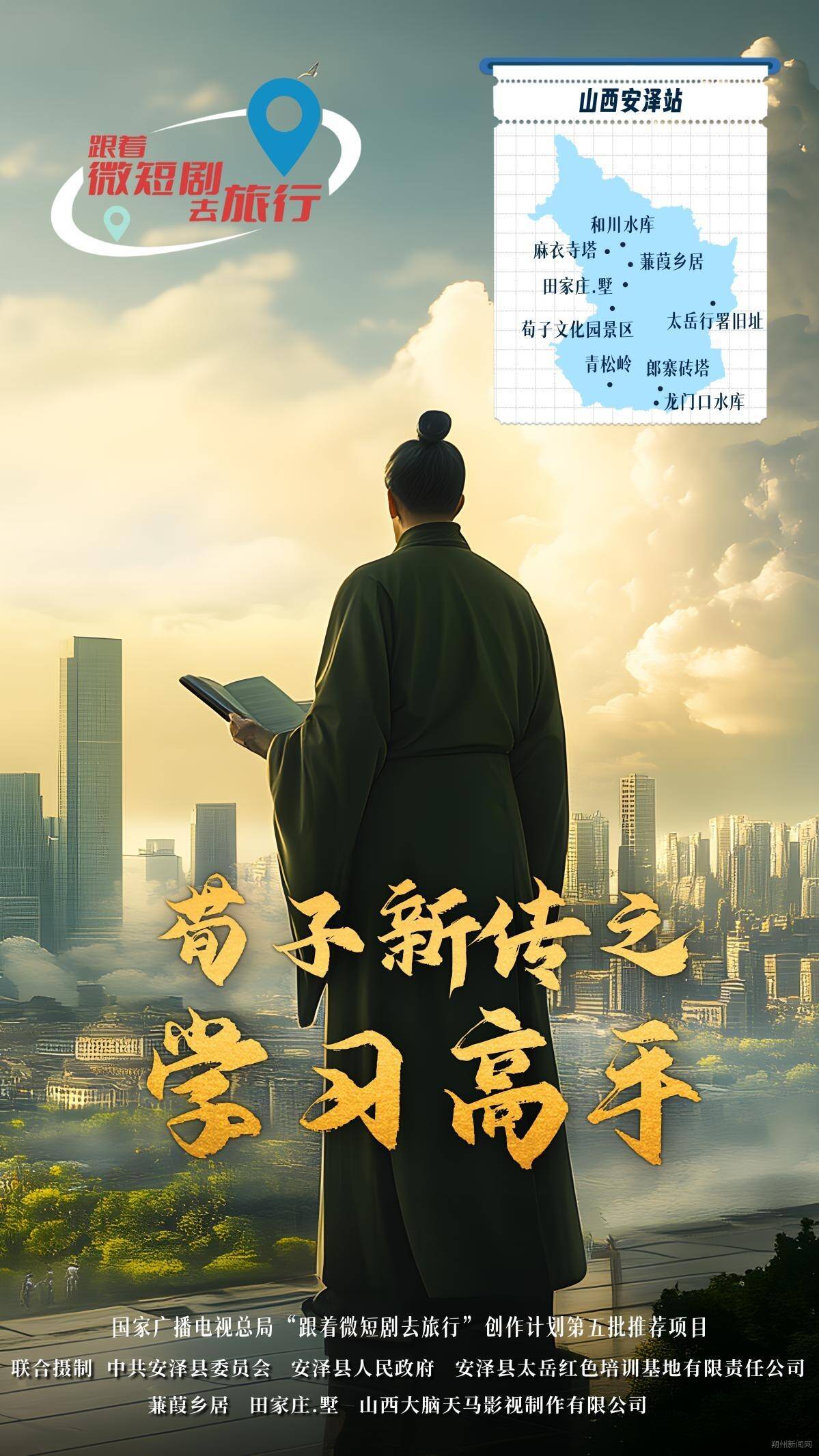 “讲述中华文明起源和文化传承故事”主题的微短剧《荀子新传之学习高手》由山西局指导,中共安泽县委员会、安泽县人民政府、安泽县太岳红色培训基地有限责任公司、山西大脑天马影视制作有限公司联合摄制,2分钟*60集,取景地为山西省临汾市安泽县和川水库、麻衣寺塔、蒹葭乡居、田家庄墅、荀子文化园景区、太岳行署旧址、青松岭、郎寨砖塔、龙门口水库等,讲述了一个成绩垫底不爱学习的初中生在荀子的启发和指导下,克服自身惰性与困难蜕变成为学习高手的故事,展现了荀子故里人文景观和历史底蕴。