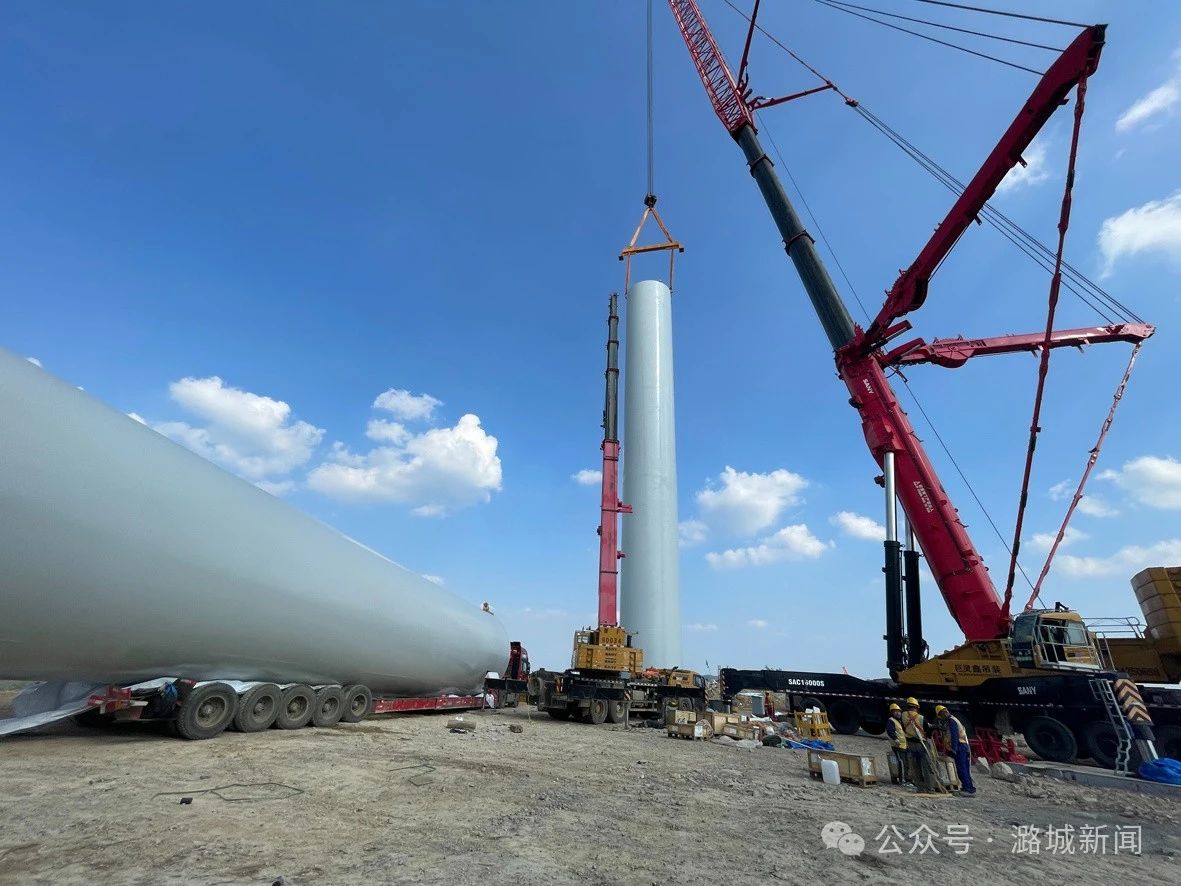 潞城天辰光运150MW风力发电项目风机塔筒吊装现场