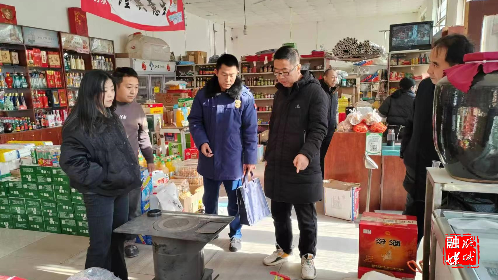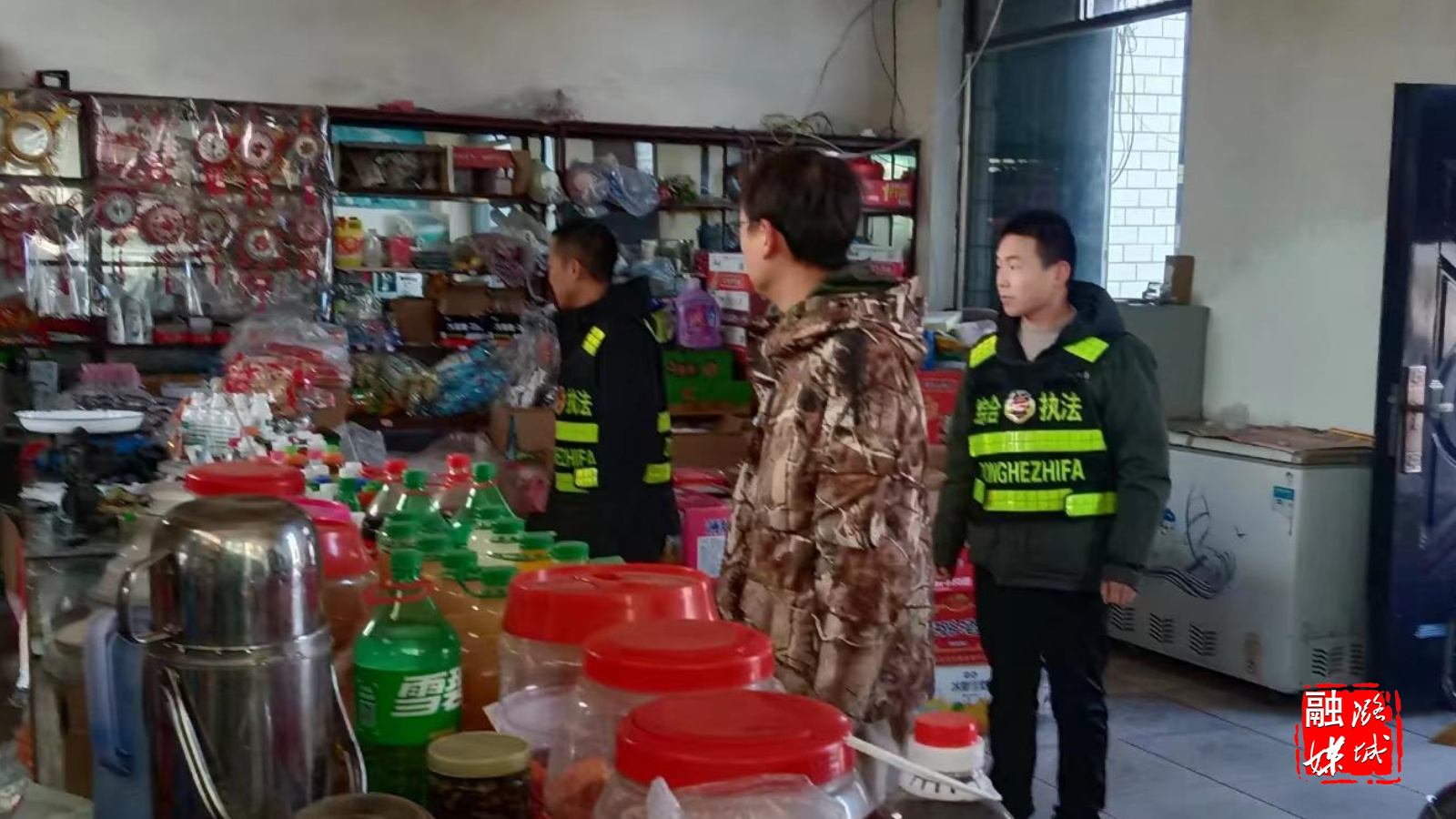 ▲辛安泉镇综合行政执法队工作人员就辖区商铺烟花爆竹非法销售情况开展排查工作。