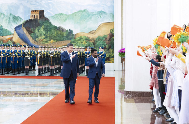 1月15日下午,国家主席习近平在北京人民大会堂同来华进行国事访问的斯里兰卡总统迪萨纳亚克举行会谈。这是会谈前,习近平在人民大会堂北大厅为迪萨纳亚克举行欢迎仪式。新华社记者 姚大伟 摄