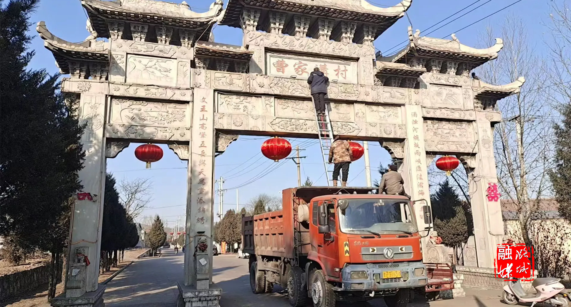 ▲店上镇邱壁村、曹家沟村组织工作人员悬挂灯笼,营造喜庆祥和的节日氛围。