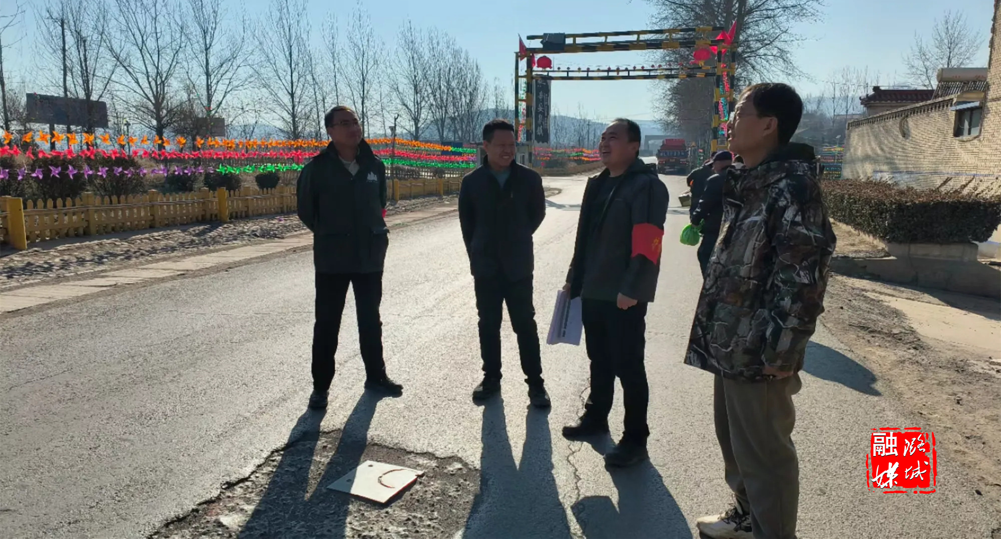 ▲辛安泉镇相关负责人在石梁村查看春节氛围营造情况。