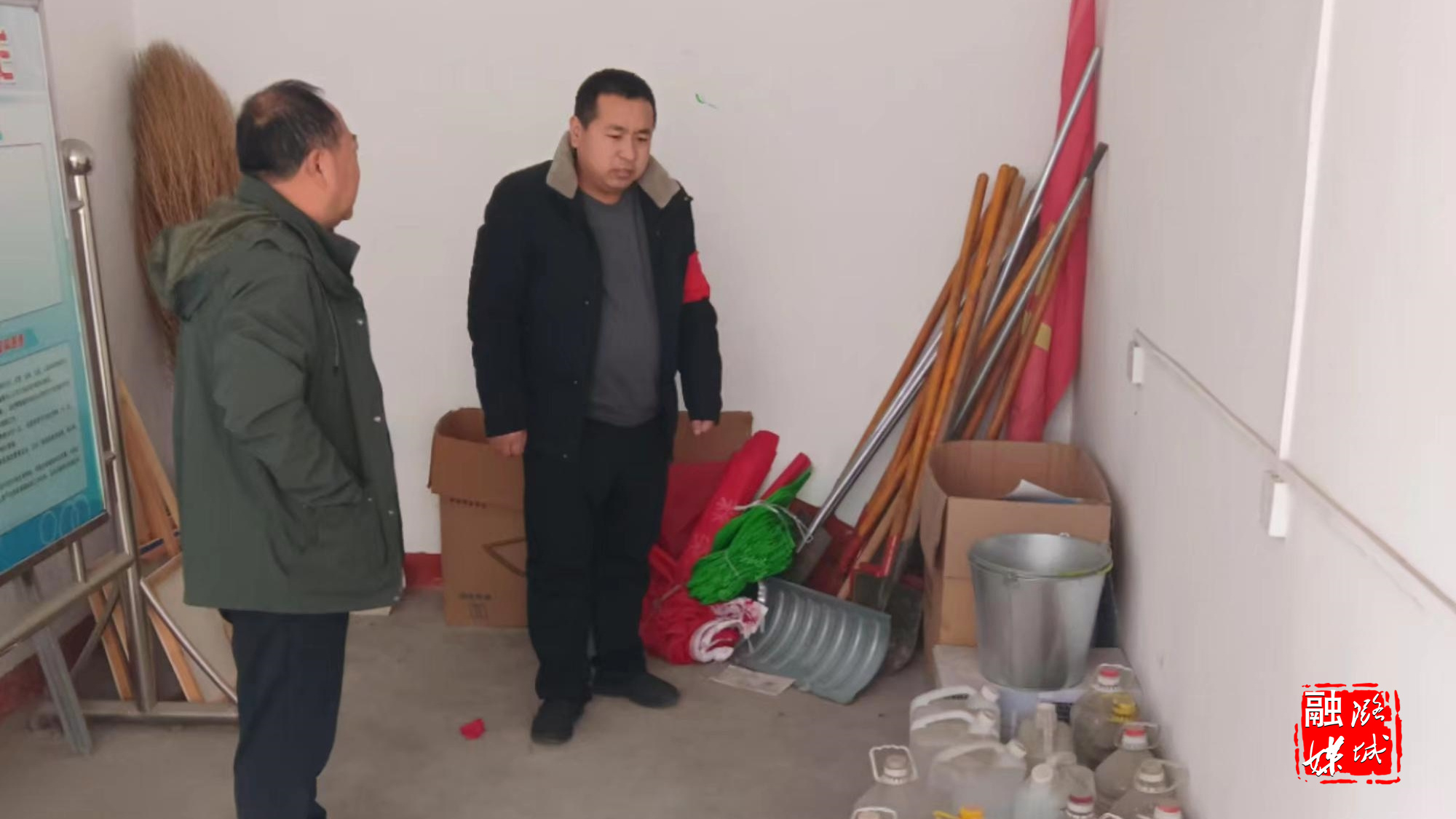 ▲辛安泉镇相关负责人在潞河村查看防火物资储备情况。