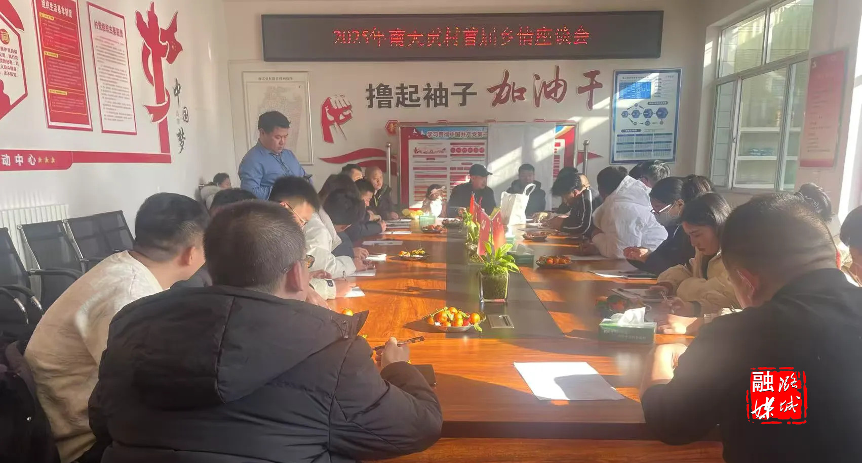 ▲翟店街道南天贡村召开后备人才乡情座谈会,为村级发展建言献策。