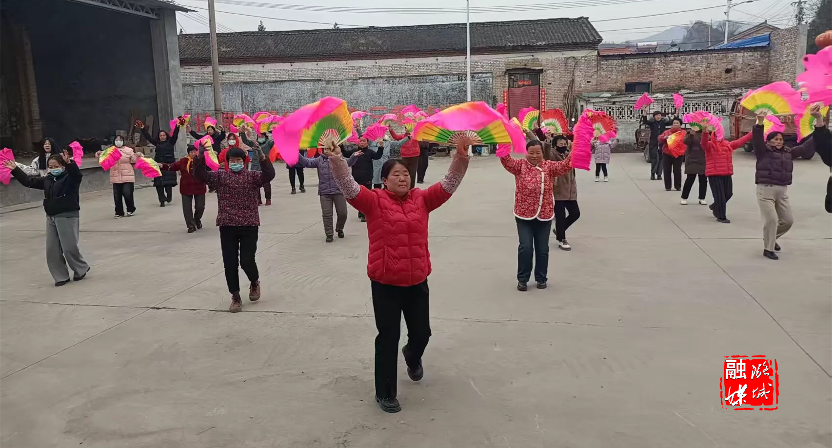 与此同时,村中心广场上的高跷队正在紧锣密鼓地排练。手拿彩扇的表演者们身姿矫健、步伐灵动,他们中既有经验丰富的老手,也有朝气蓬勃的新人,在基本动作训练的基础上,演员们还需要进行团队练习,变换各种造型和队列。