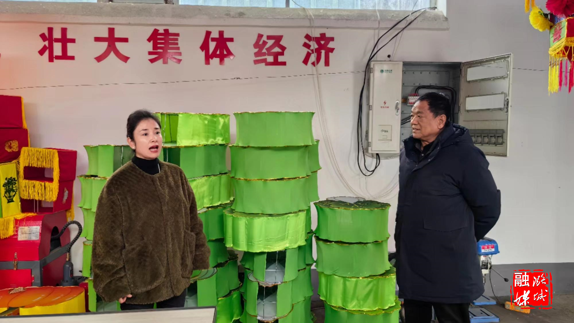 ▲辛安泉镇相关负责人在西流南村实地查看花灯加工车间运行情况。