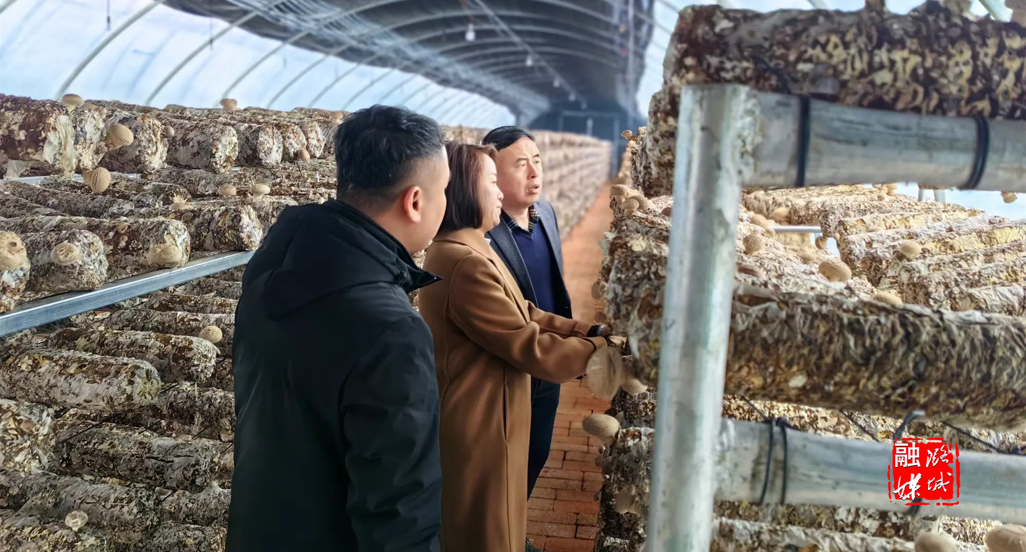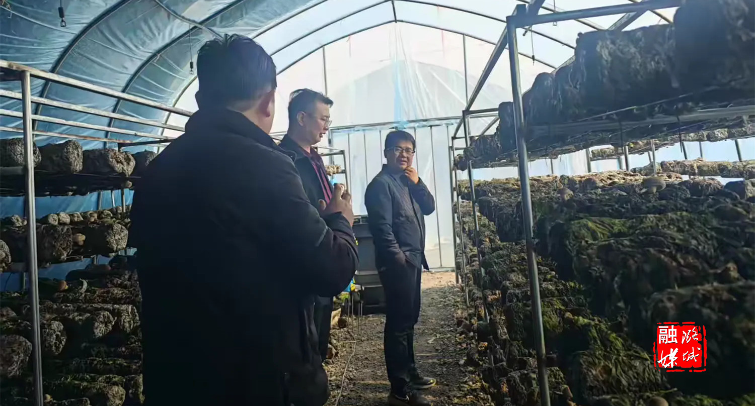 ▲黄牛蹄乡相关负责人同外地客商到香菇大棚进行经验交流分享。
