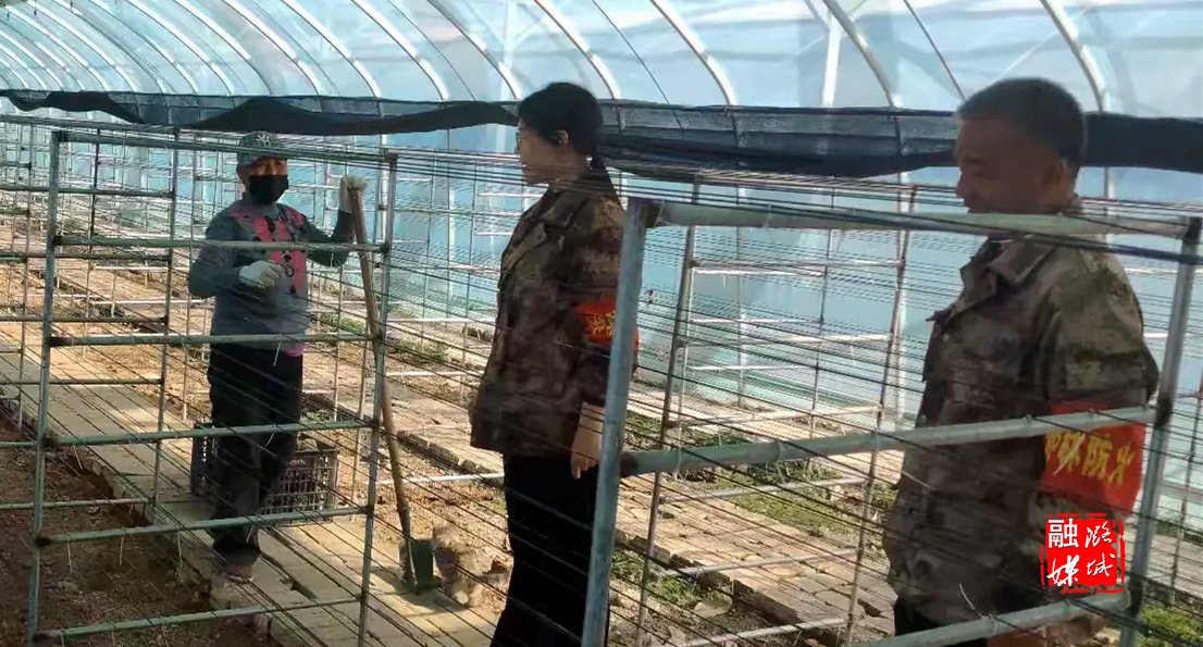 ▲成家川街道工作人员在黄池村调研香菇种植基地二期项目进展情况。