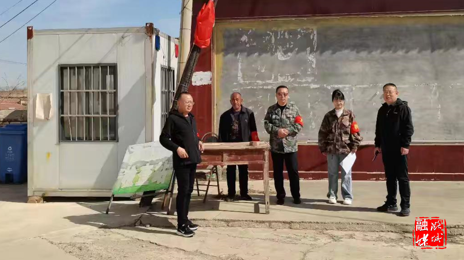 ▲黄牛蹄乡负责人同浊漳河谷古建文化传承保护基地项目设计方、村主干在辛安村就设计细节进行商讨,推进项目进度。