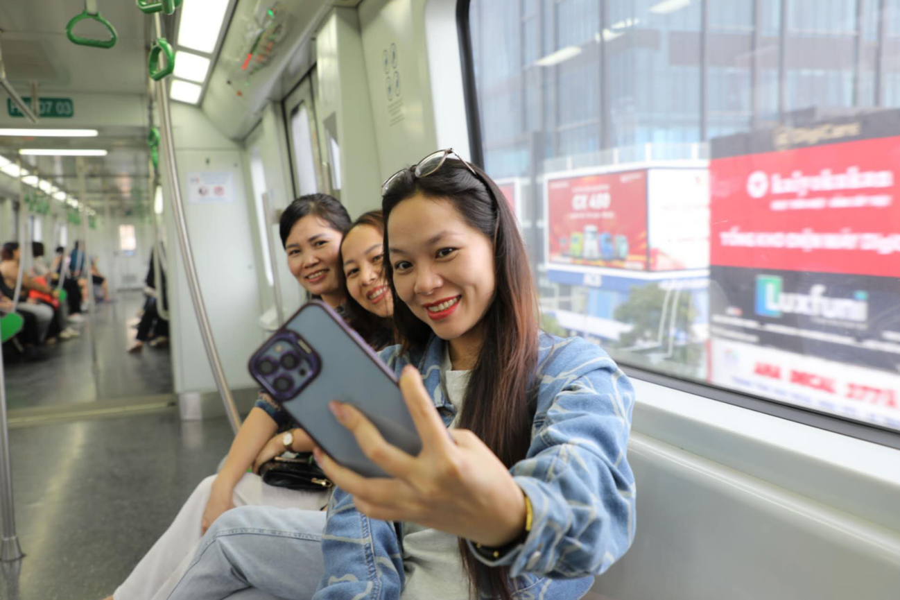 越南当地民众在河内吉灵-河东线轻轨车厢里自拍。(人民日报记者 沈小晓 摄)