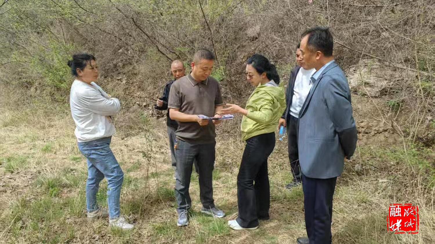 ▲黄牛蹄乡负责人陪同山西丹朱农业科技有限公司负责人到安陵寺实地查看中华蜂选址情况。