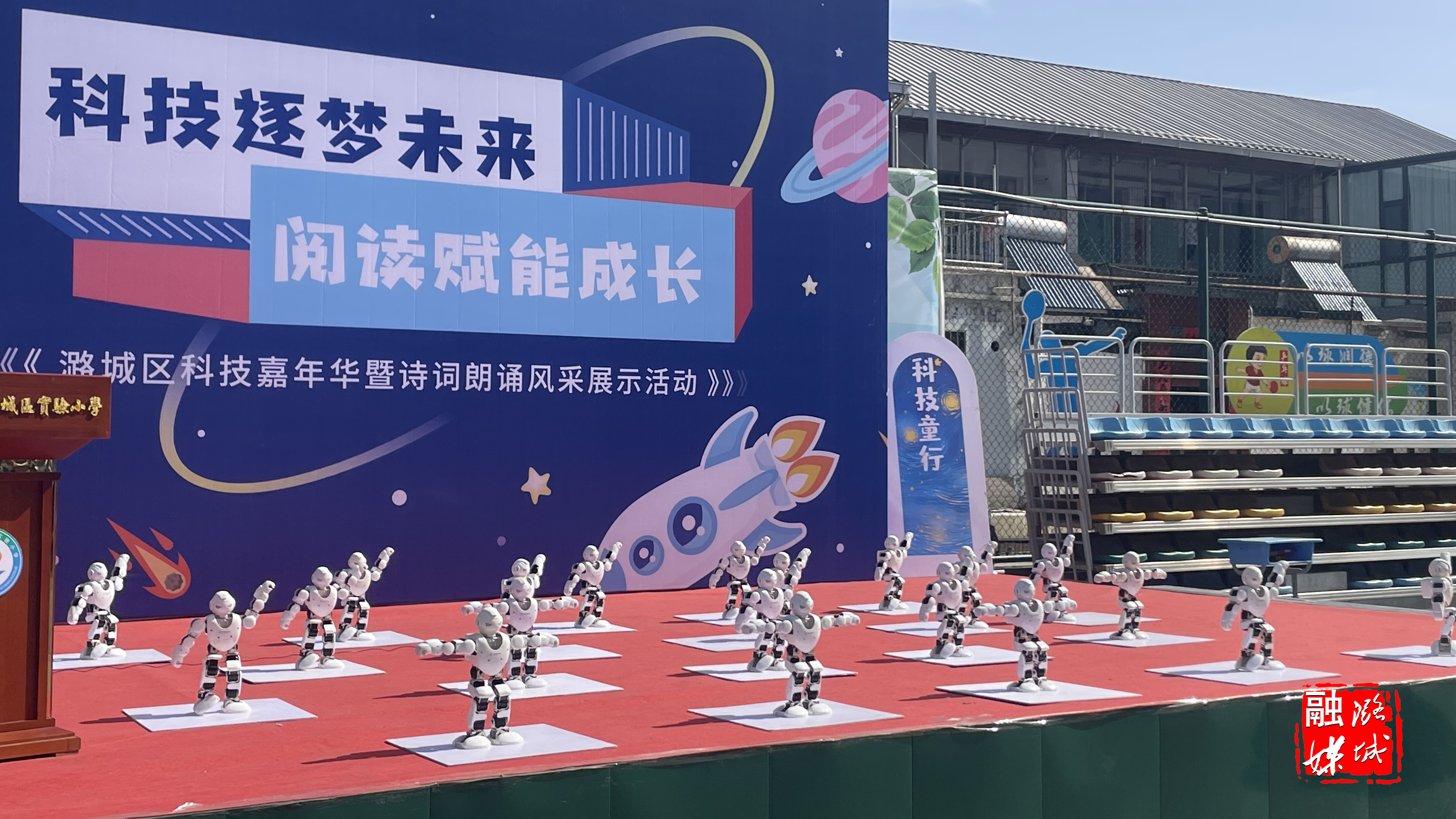 上午 9 时,伴随着机器人整齐划一的舞蹈,活动正式拉开序幕,其中,诗朗诵《大美潞城 我们颂》融合声画技术展现潞城山水人文;科学实验秀通过“空气炮”“液氮蘑菇云”等互动实验揭示科学奥秘;《诗韵风华》《诗意节气》则以古今对话形式,呈现传统文化与现代科技的共生共荣,让学生们在品味诗词之美的同时,也领略到了科学的魅力。