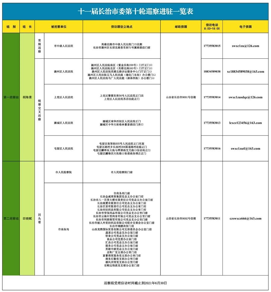 经市委批准,从2021年4月下旬至6月底,市委派出2个巡察组,分别对市中级人民法院党组开展常规巡察,并统筹对潞州区、上党区、潞城区、屯留区4个区所辖人民法院党组开展交叉巡察;对市人民检察院党组、市商务局党委开展巡察“回头看”。