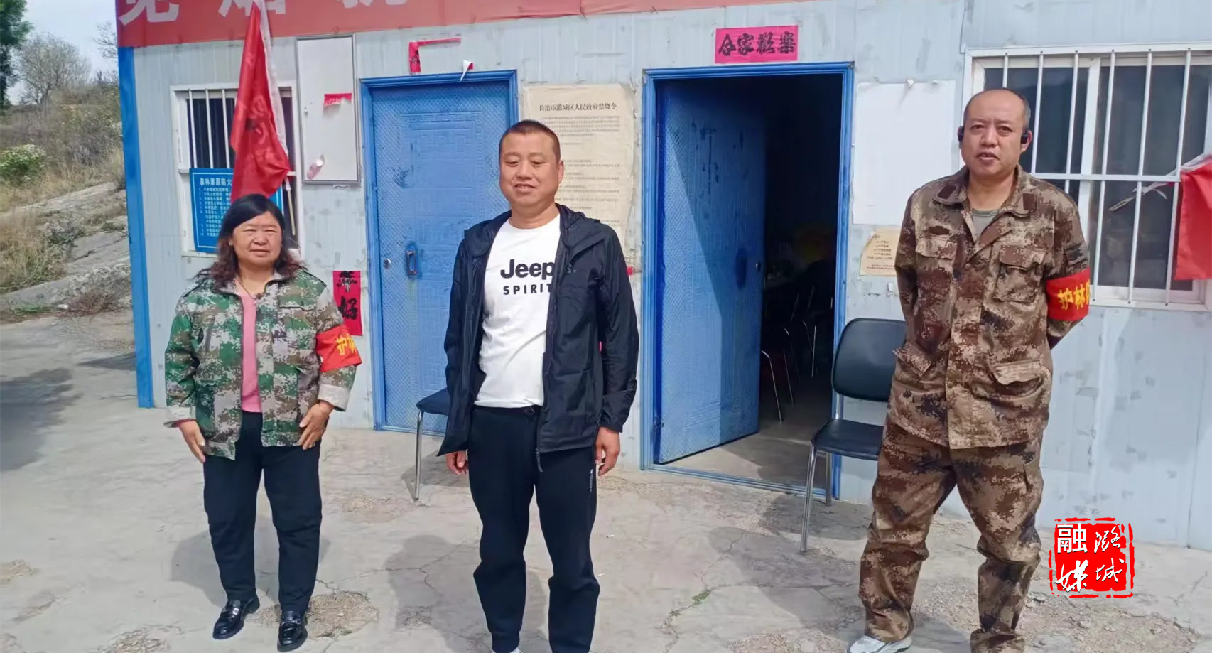 ▲成家川街道相关负责人在会山底村查看森林防火工作。