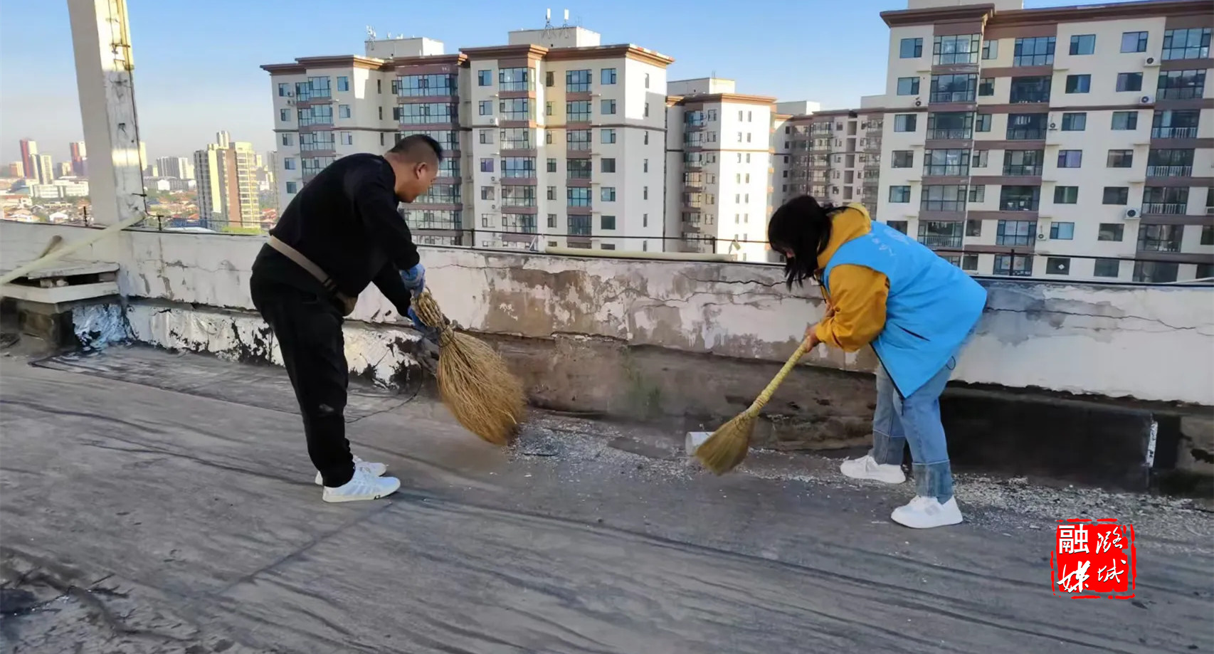 ▲潞华街道南华社区网格员协助物业清理小区破损墙皮。