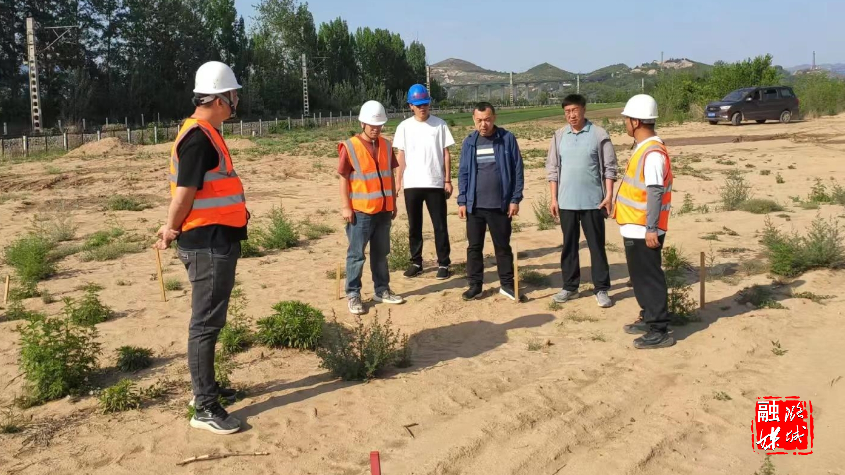 ▲辛安泉镇相关负责人同区自然资源局工作人员在西流南村就项目用地事宜进行勘测定界。