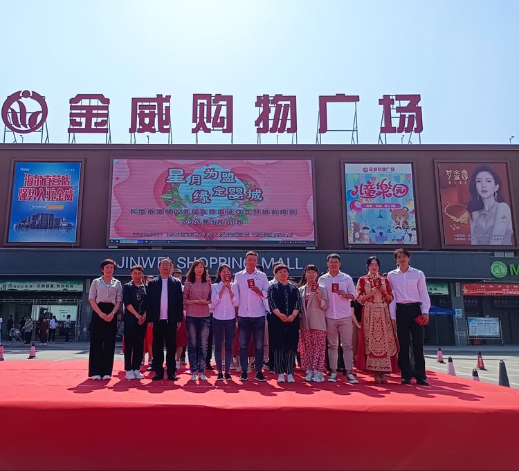 ▲5月21日上午,我区在金威购物广场举办首届“星月为盟 缘定婴城”集体颁证暨婚前培训。副区长原艳飞出席活动并为新人颁发结婚证。区委宣传部、区委统战部及区妇联等相关单位负责人共同见证了18对新人的集体颁证仪式。