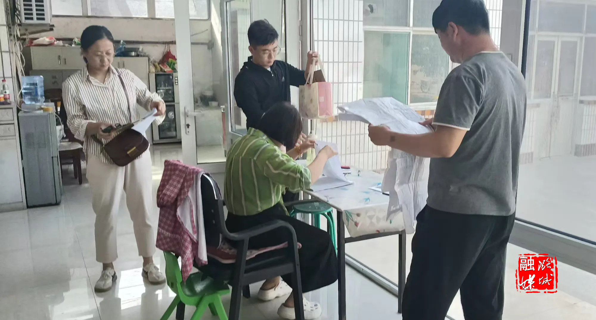 ▲店上镇工作人员同区供销合作社联合社理事会负责人就店上镇农贸市场相关事宜进行沟通交流。