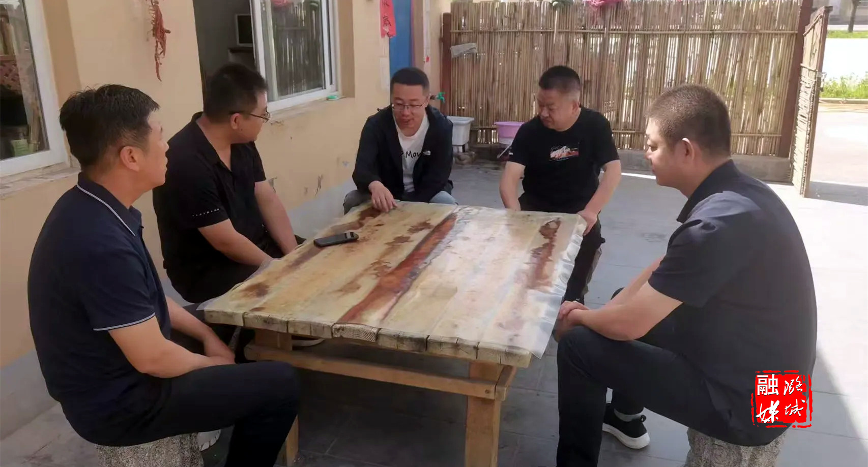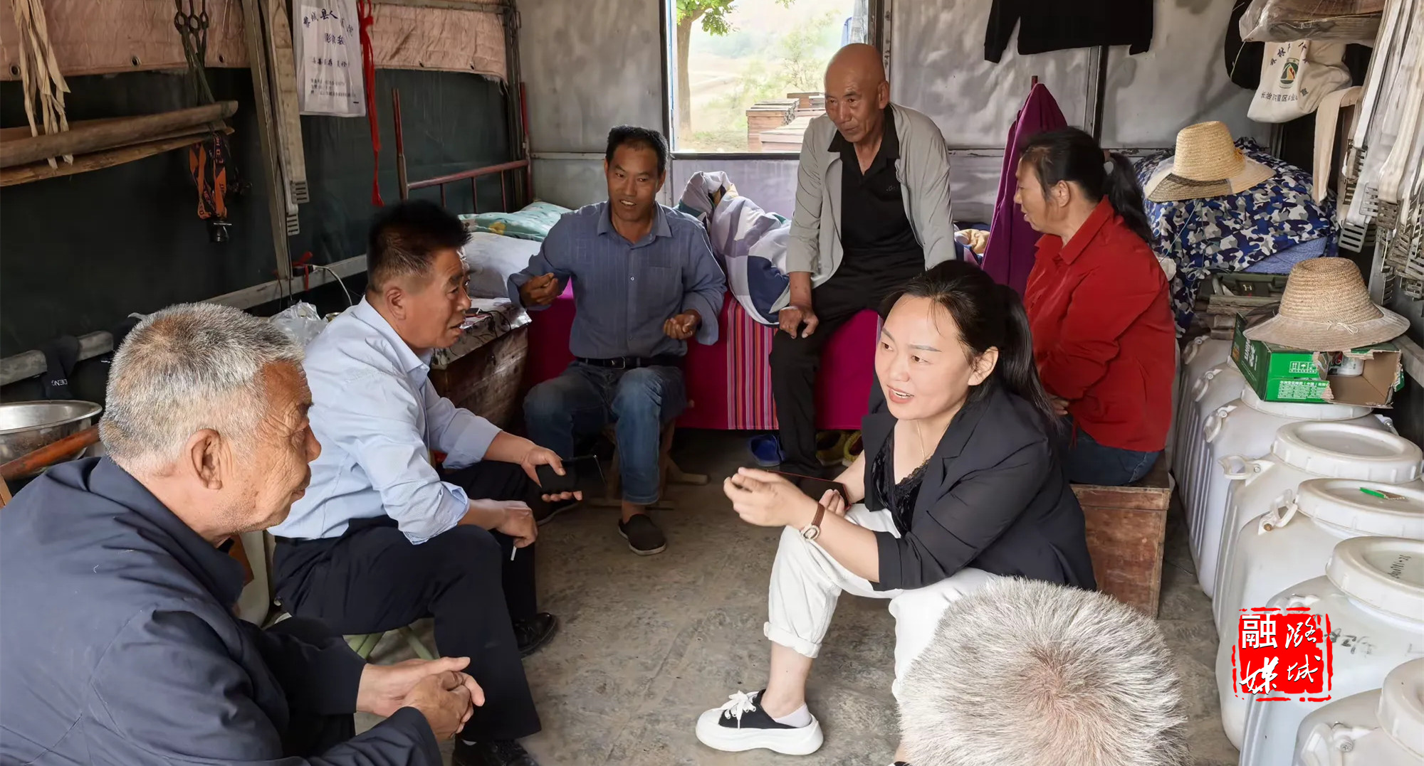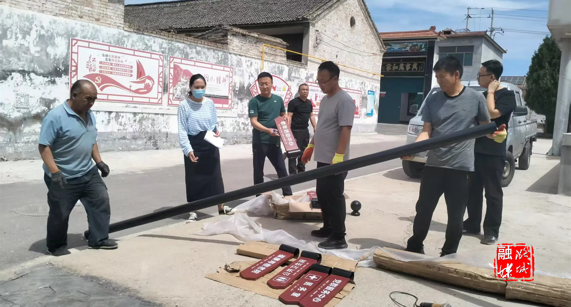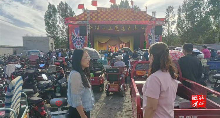 ★6月3日,微子镇相关负责人在郝家沟村查看“送戏下乡”活动开展情况。