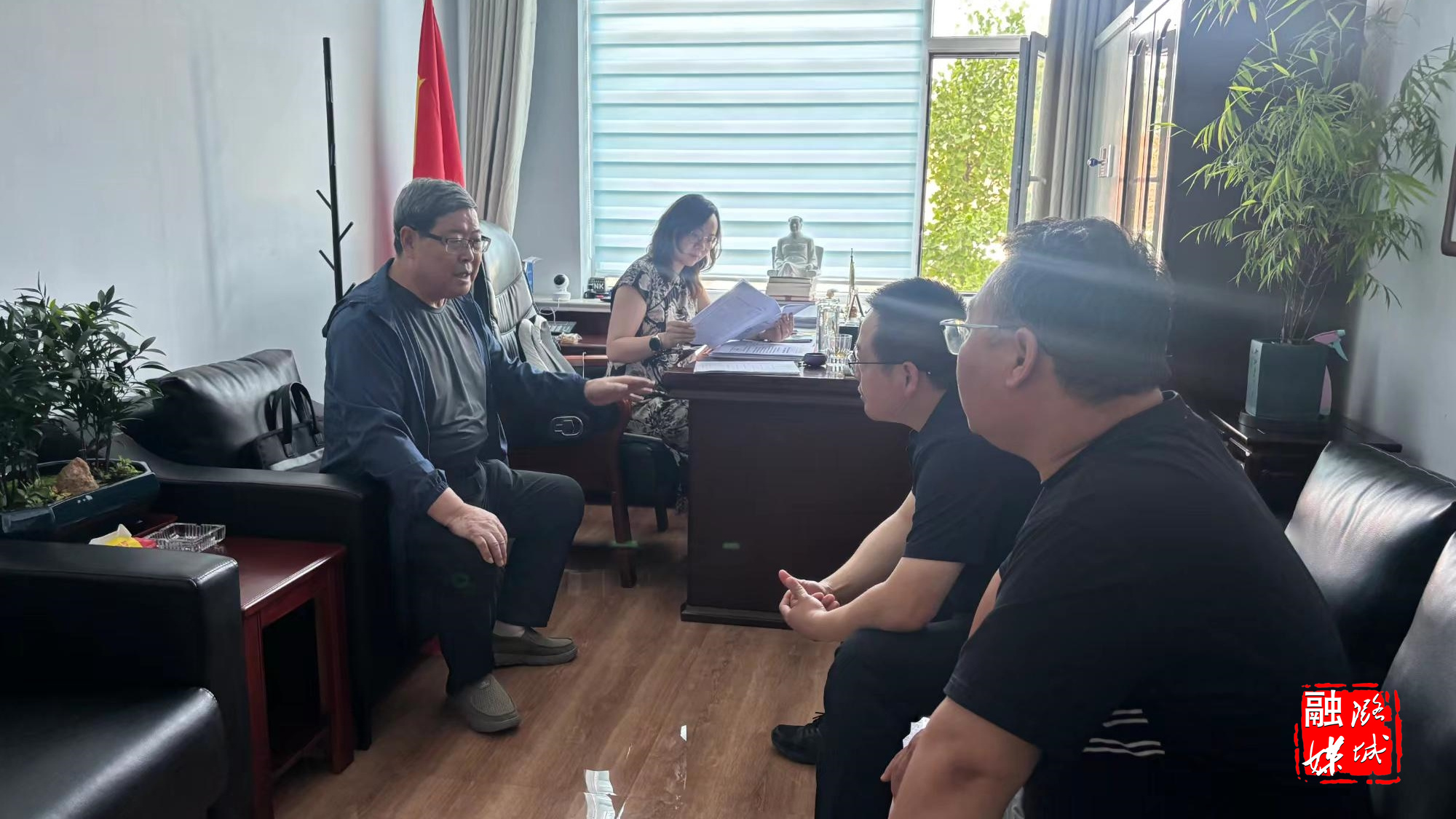 ▲翟店街道相关负责人与长治市电力公司项目负责人商讨长治潞城-康庄改接果变电站220KV线路工程路径事宜。