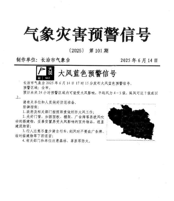 长治气象台发布大风蓝色预警信号