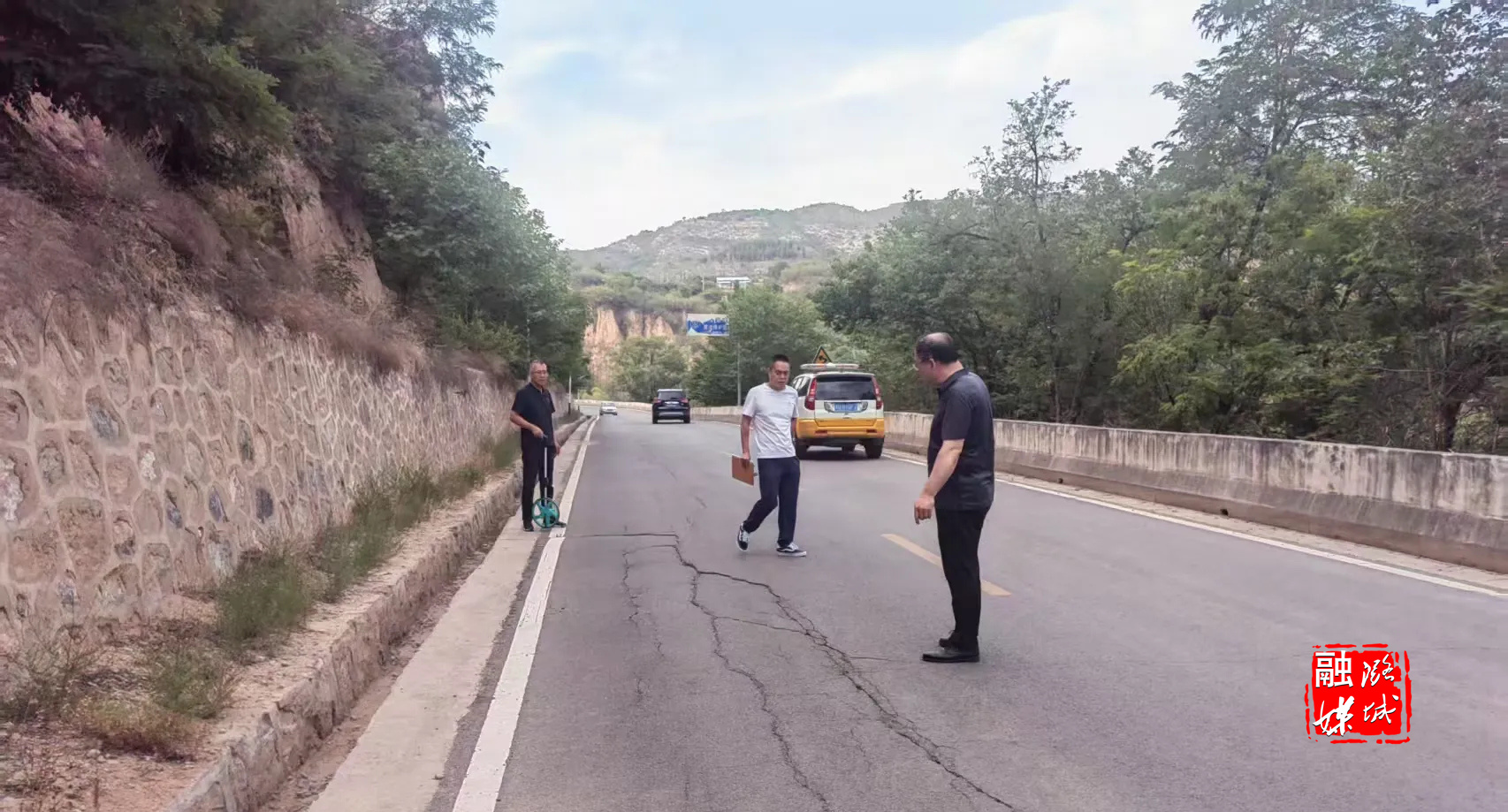 ★6月17日,区交通运输局相关负责人检查县乡道损坏情况。