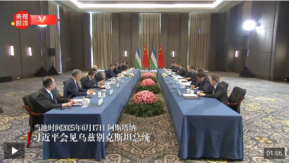 当地时间6月17日上午,国家主席习近平在阿斯塔纳出席第二届中国-中亚峰会期间会见乌兹别克斯坦总统米尔济约耶夫。