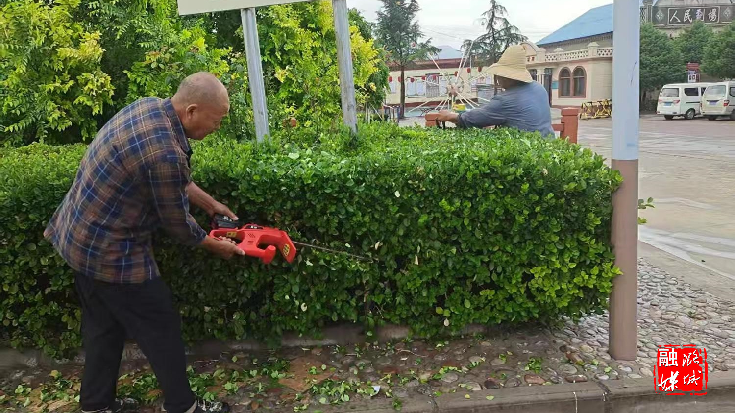 ▲辛安泉镇南流村组织人员对绿化带进行集中修剪。