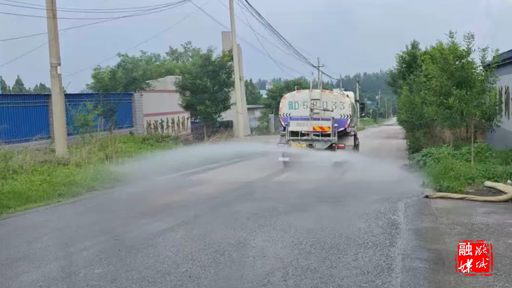 ★7月10日,翟店街道组织人员机械对辖区道路沿线进行洒水作业。