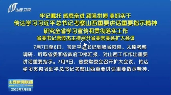 7月7日至8日,习近平总书记到我省阳泉、太原考察调研,听取省委和省政府工作汇报,对山西工作作出重要讲话重要指示。7月9日,省委常委会召开扩大会议,传达学习贯彻习近平总书记考察山西重要讲话重要指示精神,认真落实党中央关于促进中部地区加快崛起、推动黄河流域生态保护和高质量发展等战略部署,坚持稳中求进工作总基调,完整准确全面贯彻新发展理念,统筹好发展和安全,努力在推动资源型经济转型发展上迈出新步伐,奋力谱写三晋大地推进中国式现代化新篇章。省委书记唐登杰主持会议。