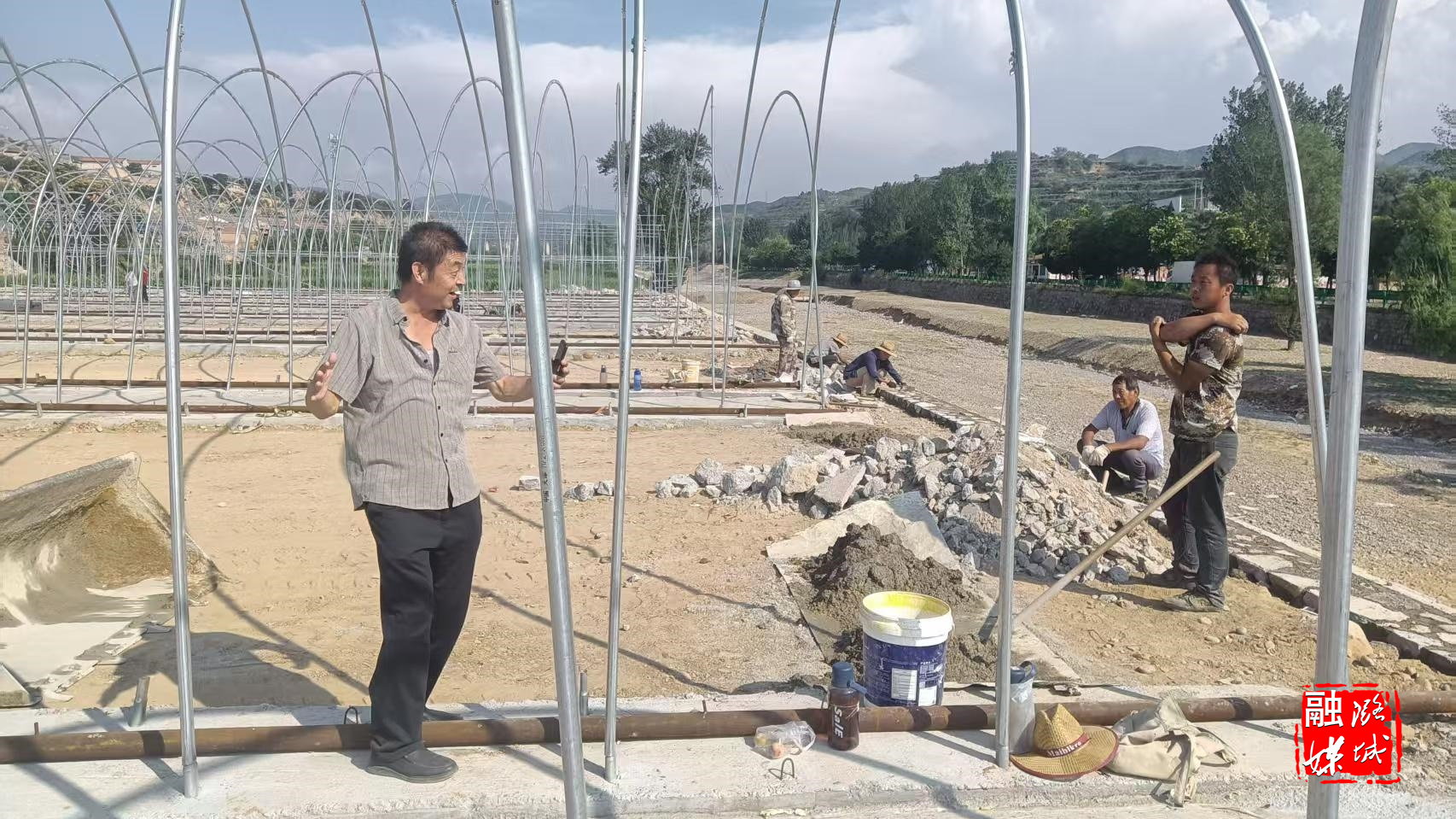 ▲黄牛蹄乡工作人员到香菇一体化项目施工现场查看工程进度。