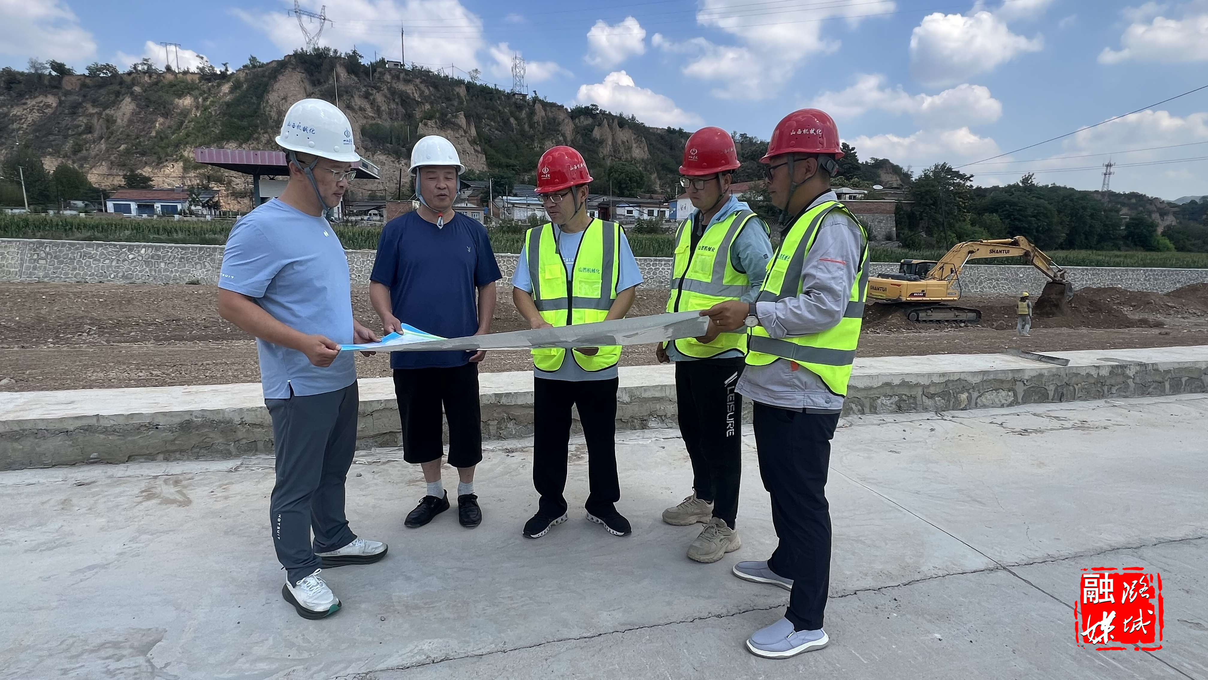 ▲店上镇工作人员到河湃村查看项目建设进展情况。