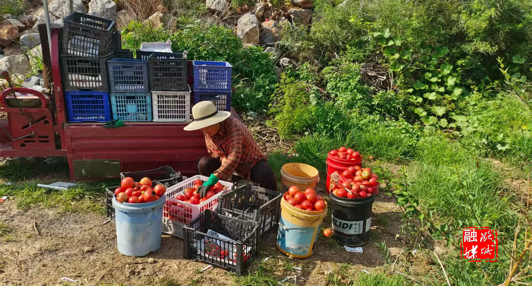 ▲成家川街道台东村组织村民采摘西红柿。