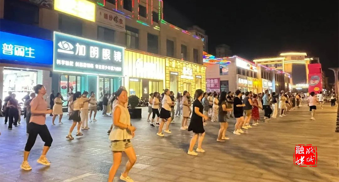 从世纪广场往西走几分钟,护城河的夜色漫过石阶,沿岸的柱子旁已坐满了人。近旁空地上,广场舞队伍正随着音乐起舞,动作整齐有力。马路对面的鼓手抡着鼓槌,“咚咚”敲得整齐,起落间引了不少人驻足。旁边不少人成对跳着双人舞,舞步舒展,为这片热闹添了份从容的韵味。